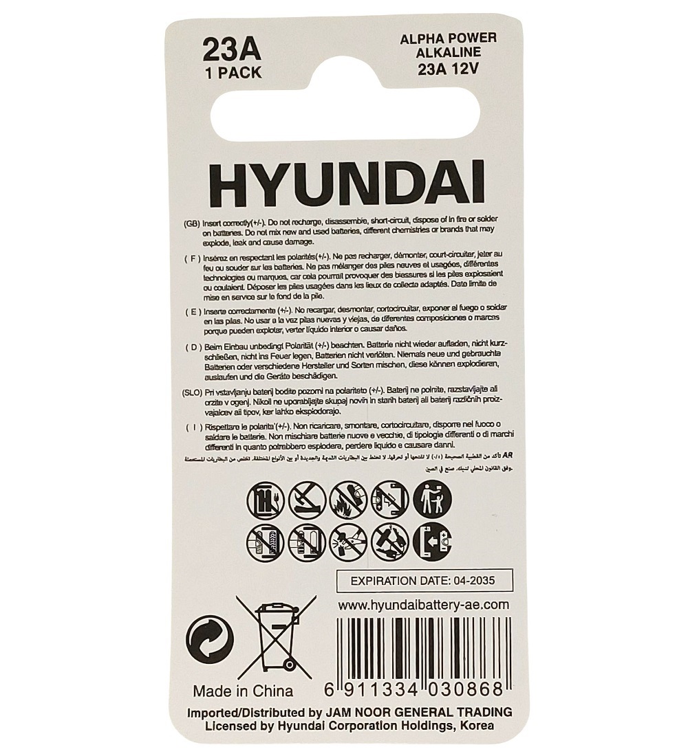 باتری ریموت آلکالاین آلفا پاور 12 ولت سایز 23A برند هیوندای