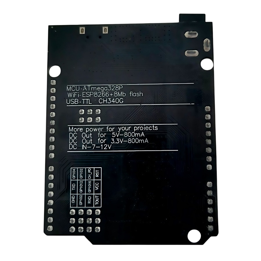 It is included full integration of microcontroller Atmel ATmega328 and IC Wi-Fi ESP8266 with 8 MB flash memory, and USB-TTL converter CH340G on one board.