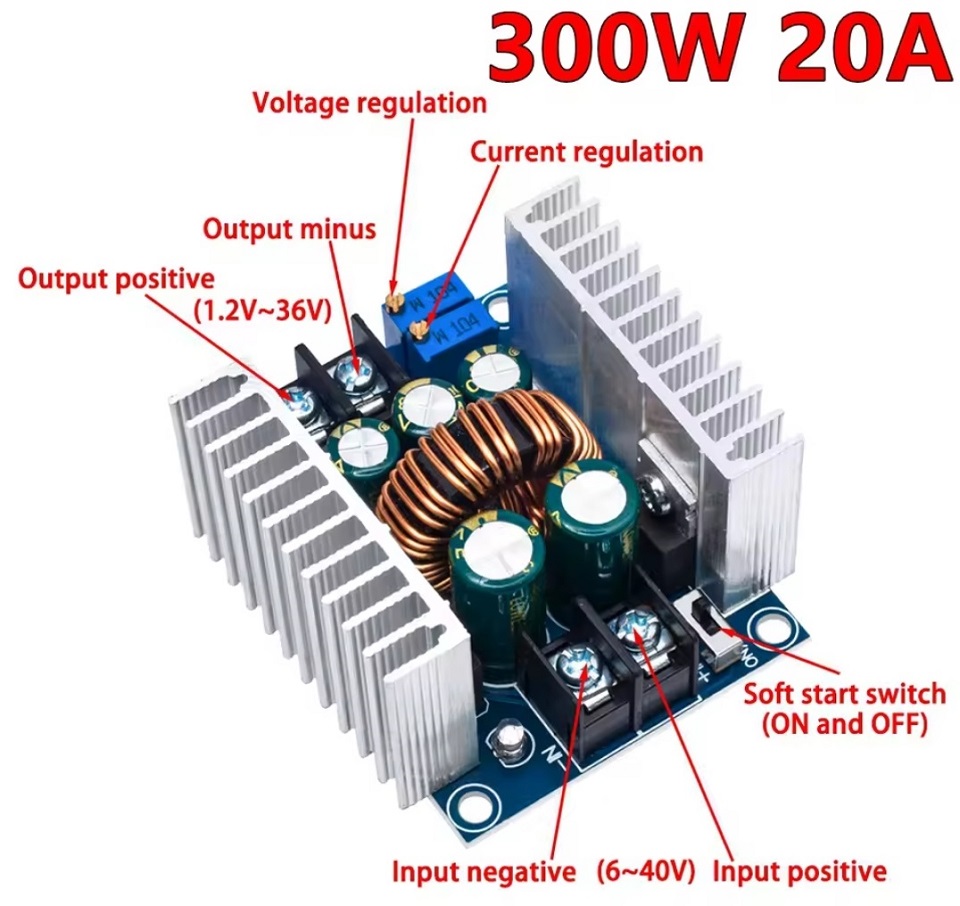 ماژول کاهنده 20 آمپر با قابلیت کنترل جریان و ولتاژ خروجی توان 300 وات